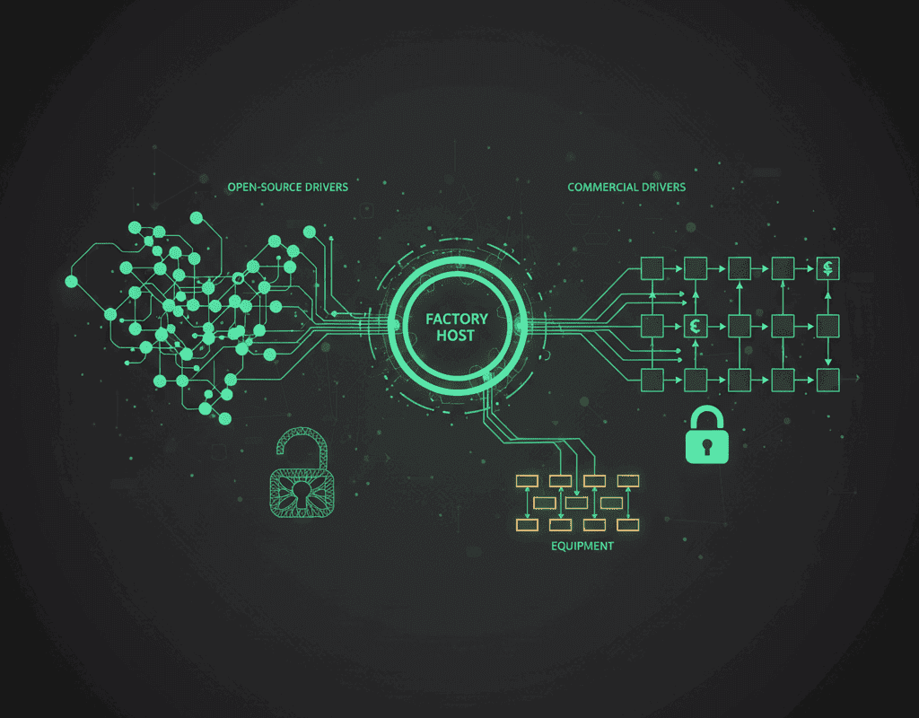 For equipment OEMs shipping 10+ tools annually, commercial drivers typically deliver 40-60% lower 5-year TCO. The crossover point where open-source becomes cheaper is approximately 5 or fewer tools total — essentially R&D or prototype environments.